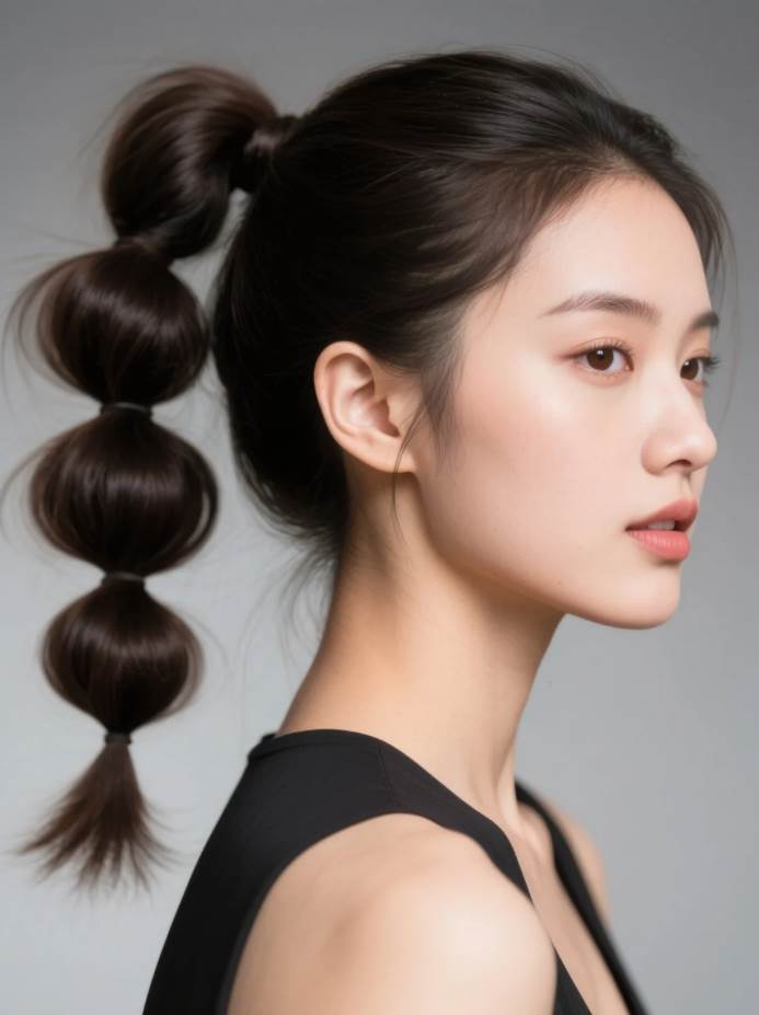 * **特色:** 將後腦勺頭髮分段紮起,形成可愛的「泡泡」狀,視覺上立刻豐盈扁塌的後腦勺,打造頭型飽滿的青春感。高位置紮髮更顯活力。