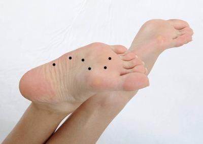 足底屬水(腎經起始),朱砂痣屬火(離卦),形成「水火既濟」貴格; 《三命通會》強調需配合「土形足」(足弓飽滿)制約水勢,否則易成「火水未濟」。