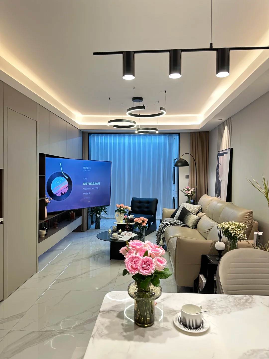 室內設計師推薦的「黃金三角法」,是以電視、沙發、主墻構成等邊三角形。電視高度需與坐姿視線齊平,避免仰頭造成壓迫感;沙發與電視距離保持屏幕對角線2.