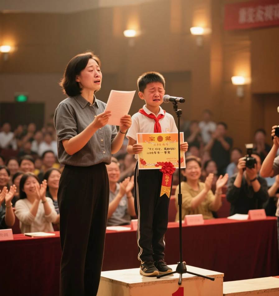 當老師讀到這里時,聲音不禁顫抖起來,淚水奪眶而出。台下的觀眾也被這真摯的情感所打動,許多人紛紛擦拭著眼淚。小明的媽媽也在現場,她早已泣不成聲,心中滿是欣慰與感動。