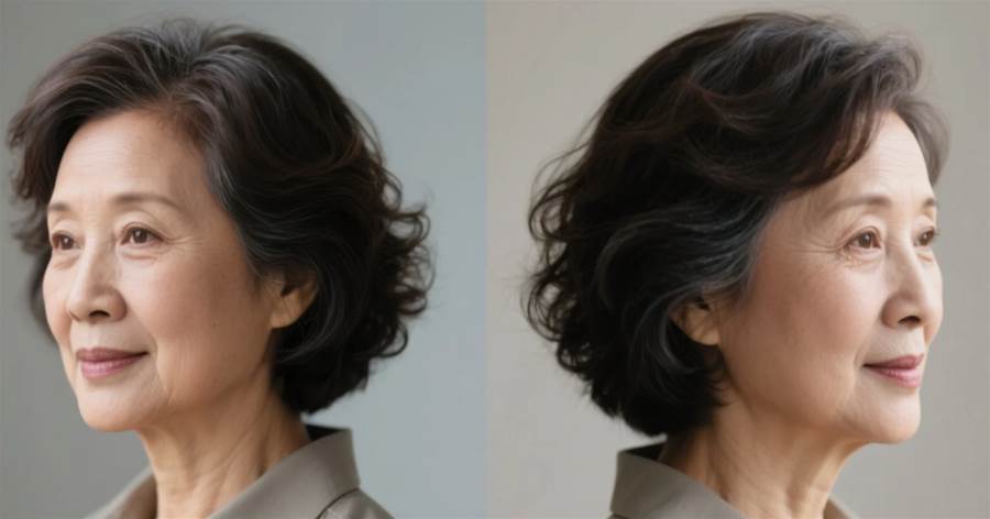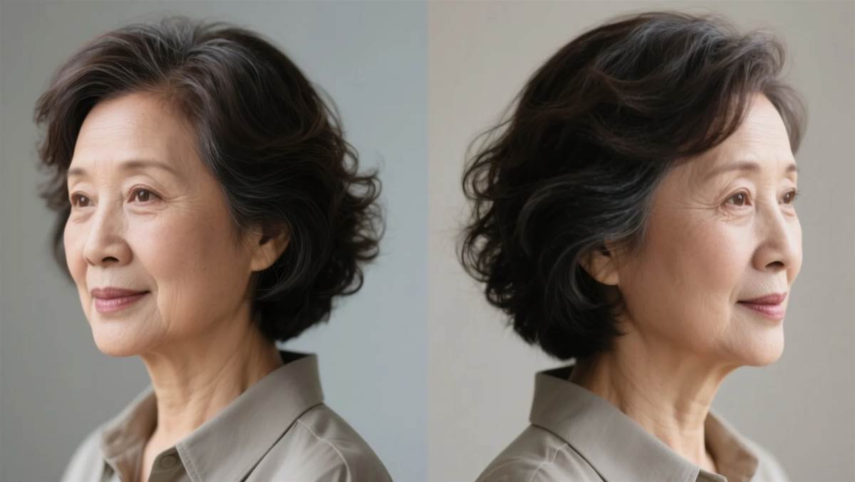 * **特色精髓:** 長度在耳下或齊耳,發絲燙出中小卷度(避免小卷顯老),打造整體豐盈蓬松效果。搭配非常輕薄的空氣劉海,只需幾縷,微微遮蓋額頭最高處即可,減齡不厚重。