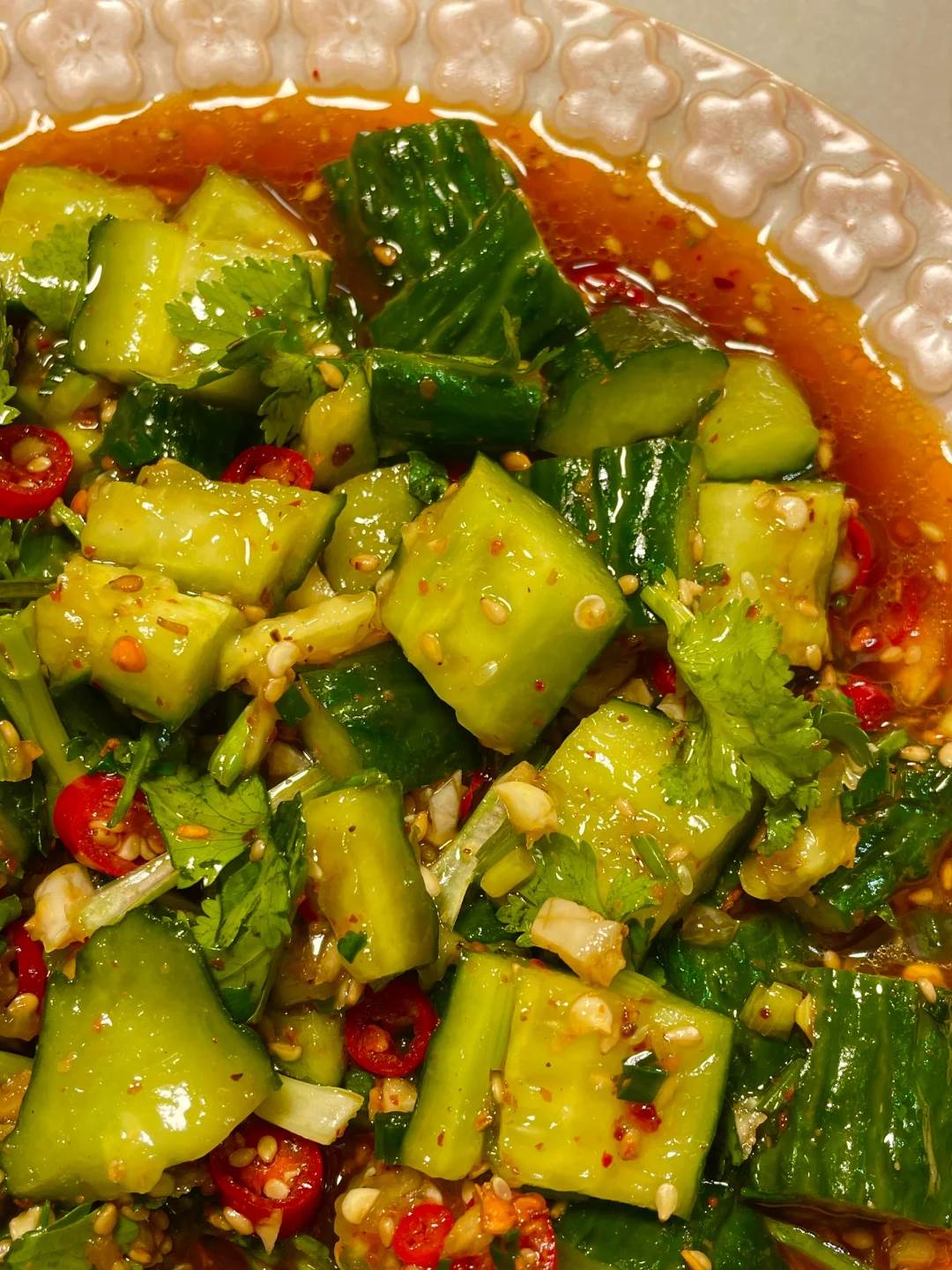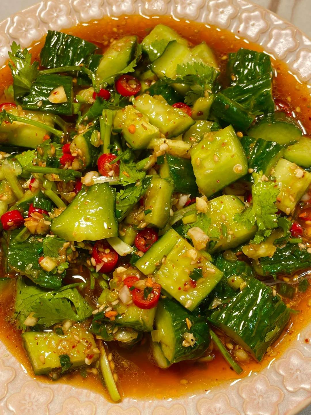 這種分階段調味法既能防止黃瓜過度出水,又能讓酸辣滋味層層滲透。最后撒上現焙的白芝麻和油炸花生碎,冷藏20分鐘后食用,冰涼的汁水裹挾著蒜香在齒間迸發,脆生生的口感仿佛在咀嚼夏日清風。