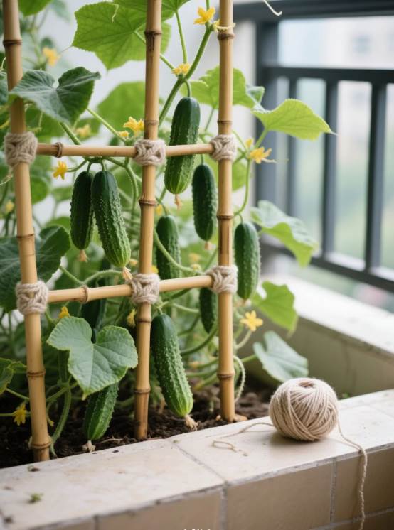 選黃瓜苗北側30厘米的位置,把3根竹竿呈三角形[插·入]土里,頂部交叉處用繩子扎緊。重點來了:每根竹竿入土深度要超過30厘米,支架整體向南傾斜15度(這樣采光更好)