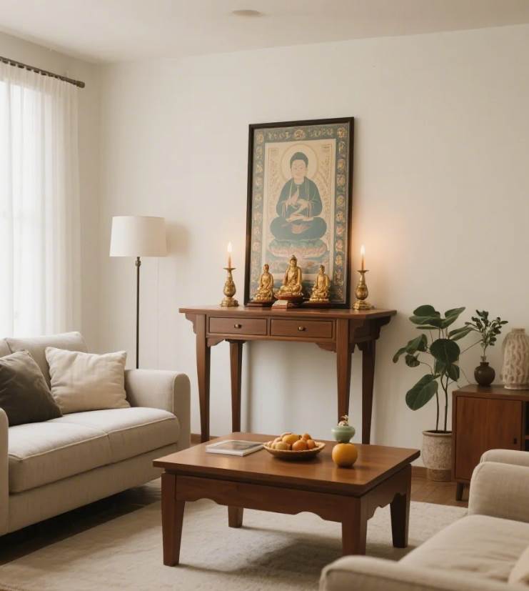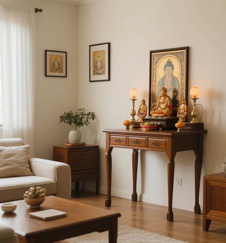 神明桌最忌「背空虛、面沖煞」,傳統風水講究「坐實向明」,背后需有實墻象征靠山穩固,正面視野宜開闊明亮。最佳方位是坐東朝西(紫氣東來)或坐北朝南(迎接陽氣),若受空間限制,至少要避開正對大門、廁所、樓梯或廚房火源。曾有客戶將神桌設在開放式廚房旁,導致家人常起口角,調整方位后明顯改善。