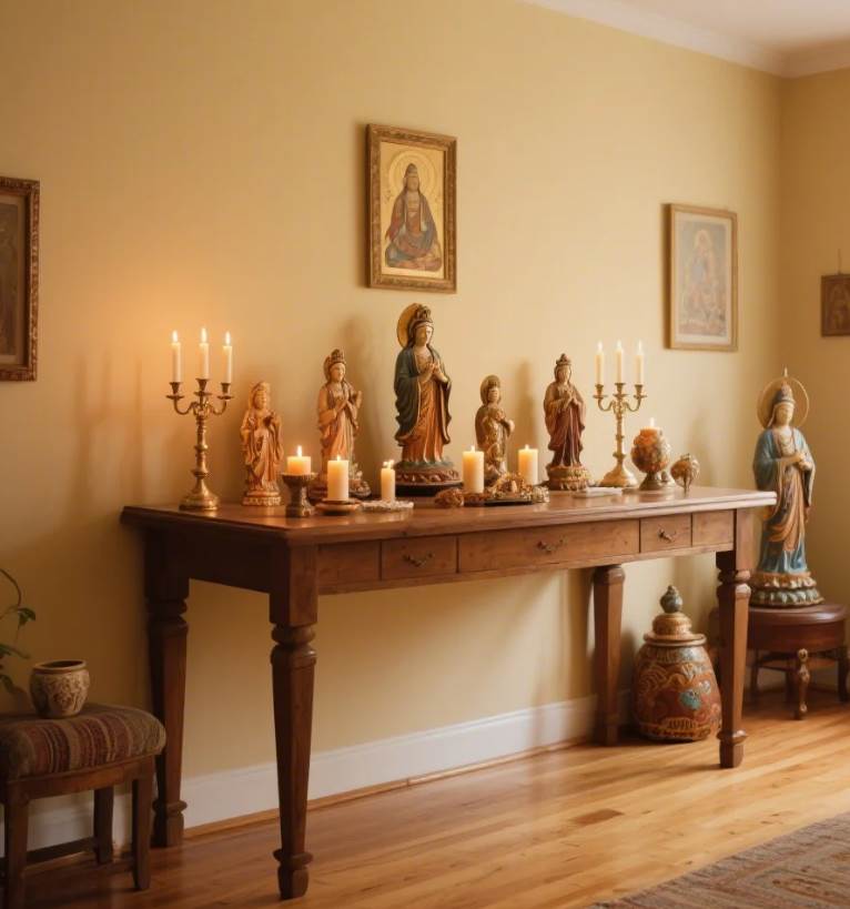 神桌高度需符合「天、地、人」三才比例,通常以210公分(含頂柜)為基準,象征「頂天立地」,過低會阻礙氣場流動,過高則形成壓迫感。桌面深度建議保持2尺半(約75公分),方便擺放香爐與供品。需特別注意神像高度不超過總柜體1/3,避免「神壓廳」的格局,曾有案例因供奉超大尊關公像,反造成事業壓力劇增。