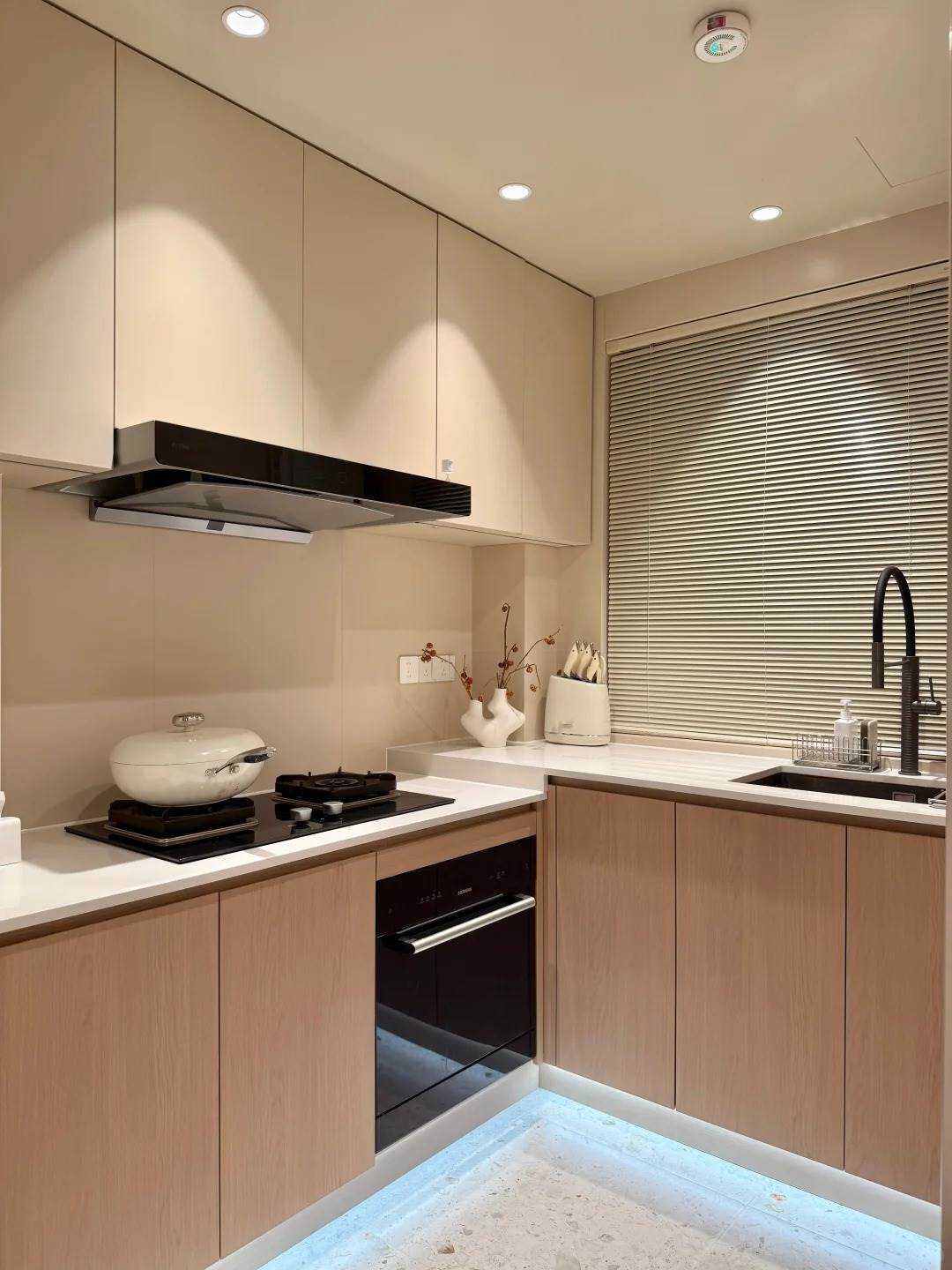 4. 色彩搭配:墻面可用米色、淡黃色系,櫥柜門板選擇啞光材質。避免大面積使用紅色裝飾,可在西南角擺放綠色小盆栽(如黃金葛)形成木生火循環。