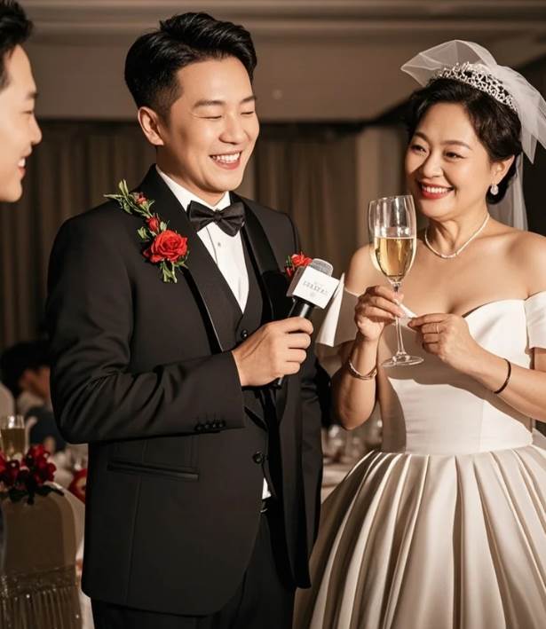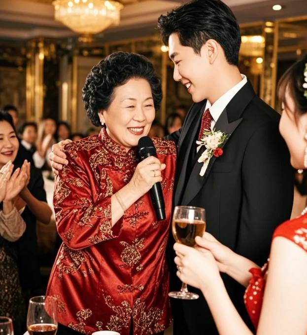 然而,當酒宴進行到敬酒環節時,和諧的氣氛被悄然打破。新郎的母親張阿姨,帶著幾分醉意,又一次緊緊摟住了兒子的肩膀,幾乎將他整個人包裹在自己懷里。她一邊搖晃著身體,一邊高聲向賓客們勸酒:「今天是我兒子的大喜日子,大家一定要喝得盡興啊!」她聲音響亮,動作幅度大,李強臉上掠過一絲尷尬與無奈,身體微微僵硬,試圖不著痕跡地掙脫,卻始終未能成功。