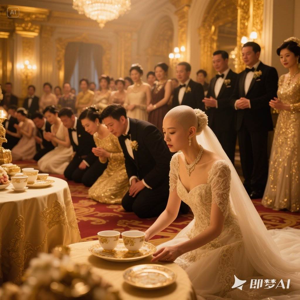 一場耗資千萬的豪門婚禮,在傳統捧茶儀式進行到[高·潮]時,新娘突然扯下滿頭烏發,露出泛著青茬的光頭。更令人震驚的是,觀禮席上數十位商界名流竟齊刷刷跪倒在地。這場本該充滿喜慶的婚宴,為何上演如此戲劇化的場面?