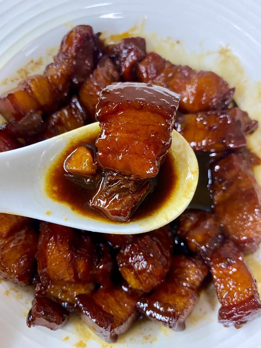 此時的五花肉表皮泛著瑪瑙般的光澤,用筷子輕夾便呈現出誘人的顫動感。