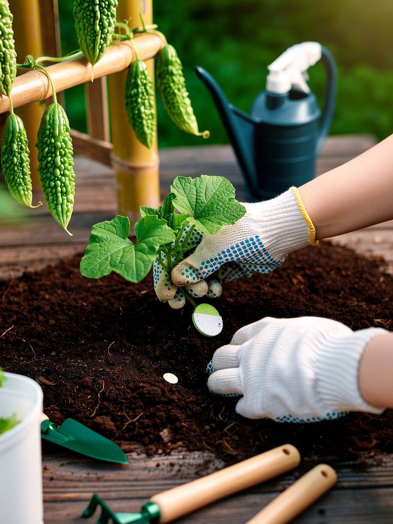 準備1片普通維生素片(藥房2塊錢一瓶的那種就行),用搟面杖碾成粉末,倒進500毫升溫水里攪化。挖移栽坑時,先把這杯維生素水倒進坑里,等水滲下去一半,再把苦瓜苗帶著原土輕輕放進去。注意!土要埋到苗根部以上2厘米,用手壓實別留空隙,這樣維生素水能直接接觸根系,刺激新根生長。