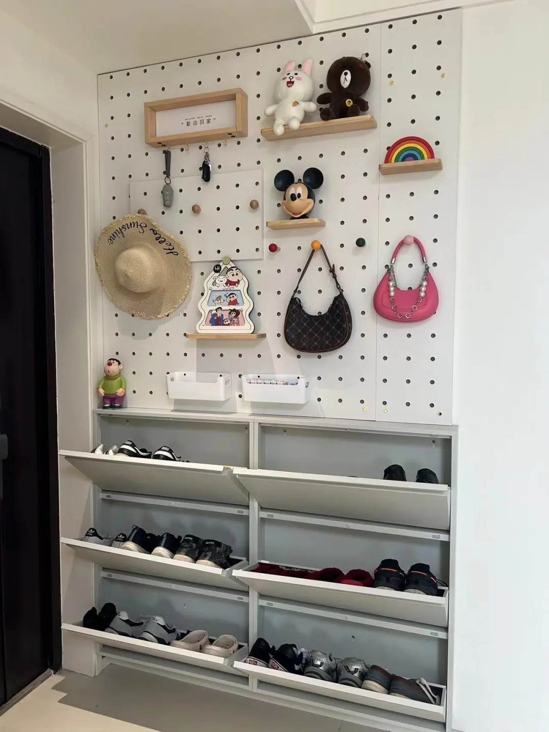 關鍵要把握「三露三藏」:露出3雙常用鞋(象徵天地人三才匯聚),藏起過季鞋款;露出3種外出物件(如雨傘、環保袋、鑰匙盤),藏起雜物箱。這種設計既能維持便利性,又符合「門納百福」的格局。