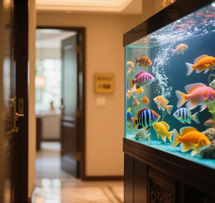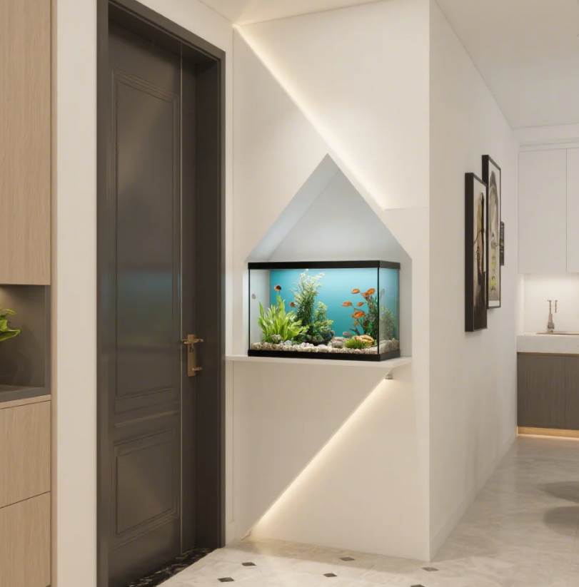 **禁忌二:廚房/廁所相鄰墻面**水火相沖是基本風水禁忌,廚房爐灶屬火,若在共用墻面擺放魚缸,容易導致家庭成員健康問題與意外破財。同理,廁所排污口產生的濁氣也會污染水質磁場。建議至少保持1.5米距離,若空間有限可用綠色植物作為緩沖。