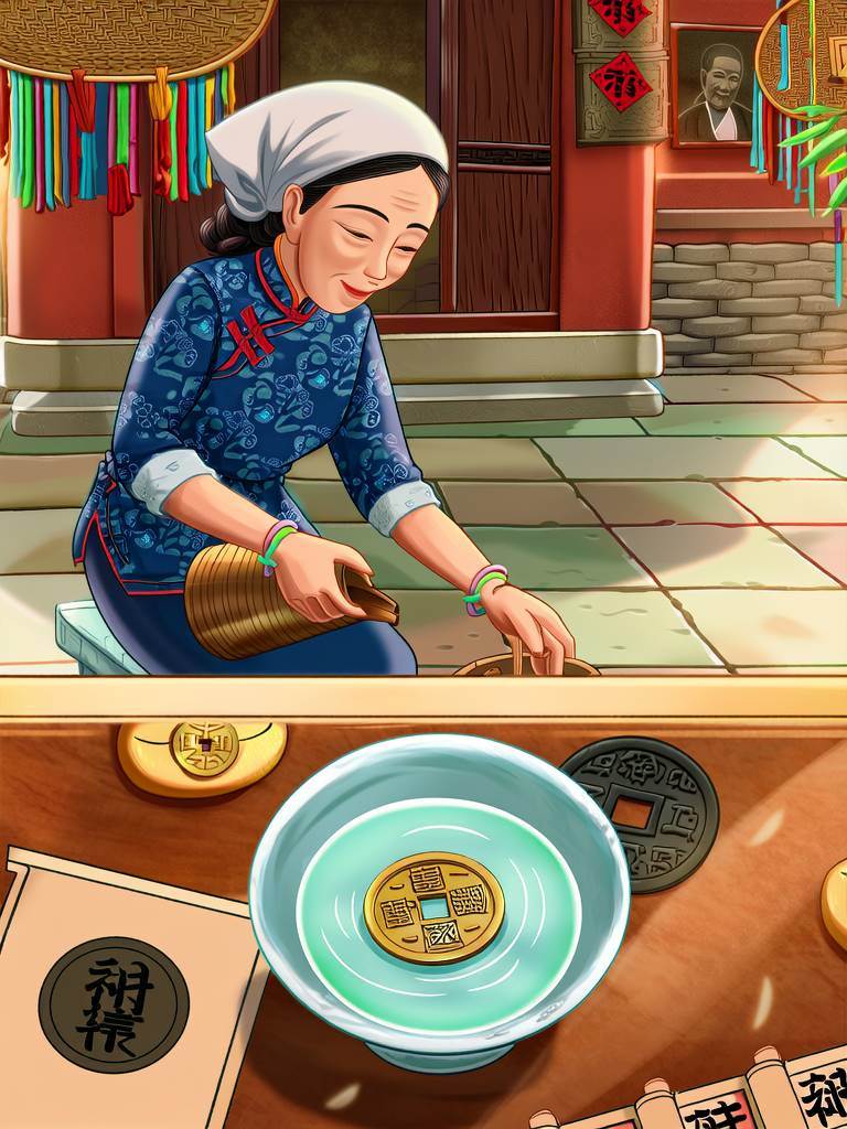 台中80歲阿嬤林黃秀妹傳授的秘訣,是將三枚流傳超過半世紀的「傳家銅錢」放入午時水中。這些經過世代使用的錢幣,因長期接觸人間財氣而形成特殊磁場,浸泡在午時水中49分鐘(取七七生發之數),待陰陽能量充分交融後,將水裝入透明玻璃瓶,搭配五帝錢或紅絲帶懸掛在店面東南方財位。