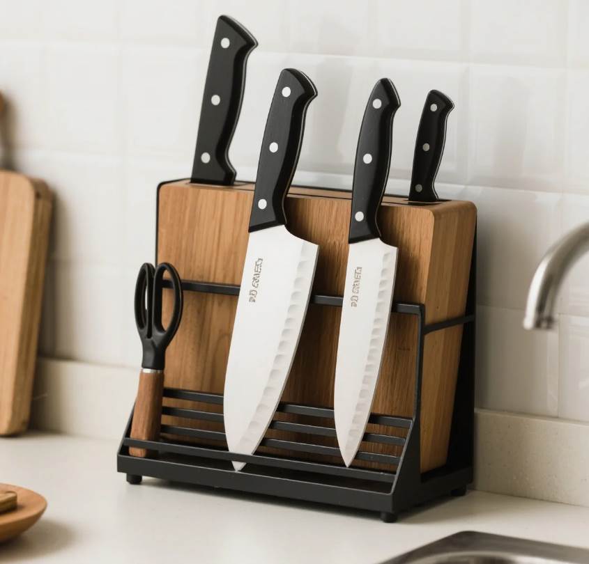 菜刀、剪刀若插在開放式刀架或掛在牆面,猶如「錢財外露」格局。刀具屬金屬煞氣,正對爐火會形成「金火相克」,易導致沖動消費、投資失誤。化解方式很簡單:改用帶門收納柜存放刀具,或在刀架覆蓋紅色布套,既能擋煞又符合安全原則。