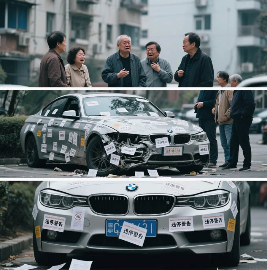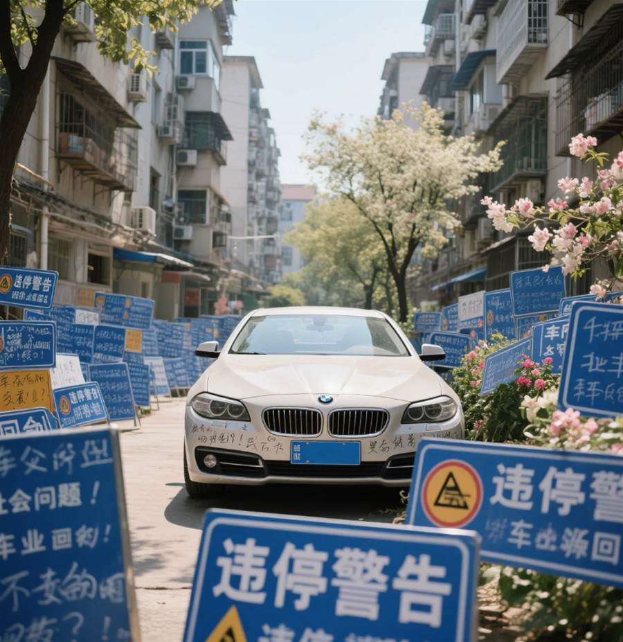 多次等待無果后,業主們的耐心被消磨殆盡。大家自發組織起來,制作了大量 「違停警告」 貼紙,上面寫著諸如 「此處禁止停車」「亂停影響他人,請規范停車」 等話語 ,密密麻麻地貼滿了寶馬車的車身、車窗。