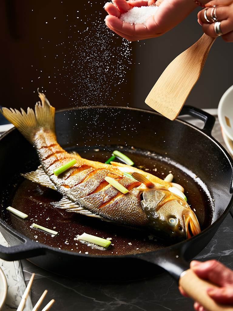 江湖一點訣,說破不值錢。抓把鹽巴豪邁撒進熱油裡,鹽粒劈啪作響像在跳踢踏舞,這時候讓擦乾水分的魚順勢滑入鍋中,神奇的事發生了——魚皮乖乖貼著魚肉,煎出金黃脆殼,整尾魚在鍋裡翻身時俐落得像體操選手。原來這鹽巴不只是調味料,滾燙油溫會讓鹽晶形成微型防護網,既隔開魚皮與鍋底親密接觸,又能加速表面脫水形成酥殼,簡直是煎魚界的金鐘罩鐵布衫。