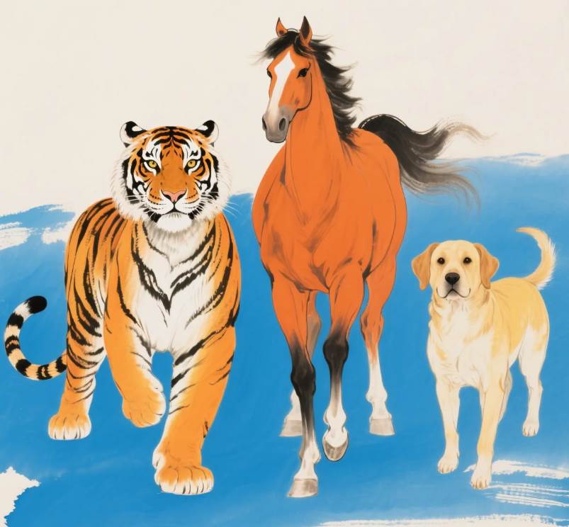另一組「寅午戌」三合火局(虎、馬、狗)則象徵熱情與行動力,五行「火」利于拓展人際、提升職場能見度,適合靠業務、專業技術或升遷加薪的家庭。屬虎者具領導魄力,屬馬者執行力強,屬狗者忠誠可靠,三者結合能帶動穩定正財。