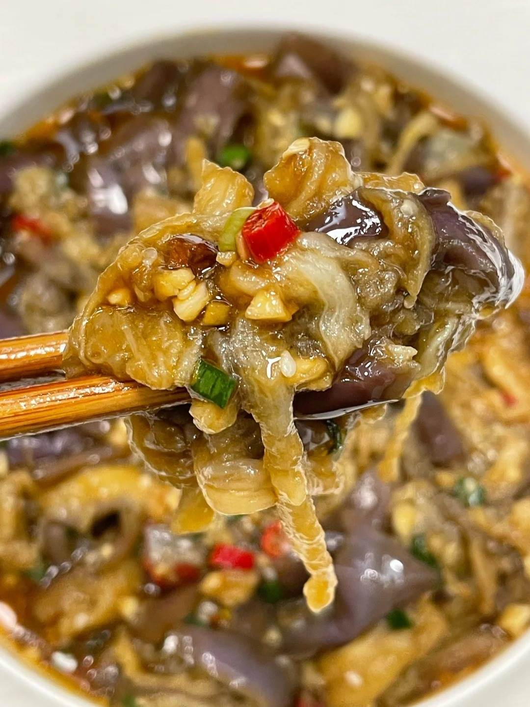 5:1"的黃金比例(生抽30ml:香醋15ml:蠔油10ml),輔以微量白糖平衡酸咸,最后用現炸的混合油(芝麻油與植物油1:2)激發香氣層次。這樣蒸出的茄子纖維如絲狀綻放,充分吸收醬汁卻不過分軟塌,入口先是蒜香撲鼻,繼而酸甜回甘,尾調帶著小米椒的跳躍辣意,搭配茄子特有的清甜竟吃出類似梅菜扣肉的豐腴感。