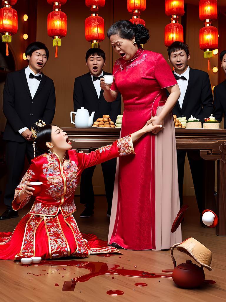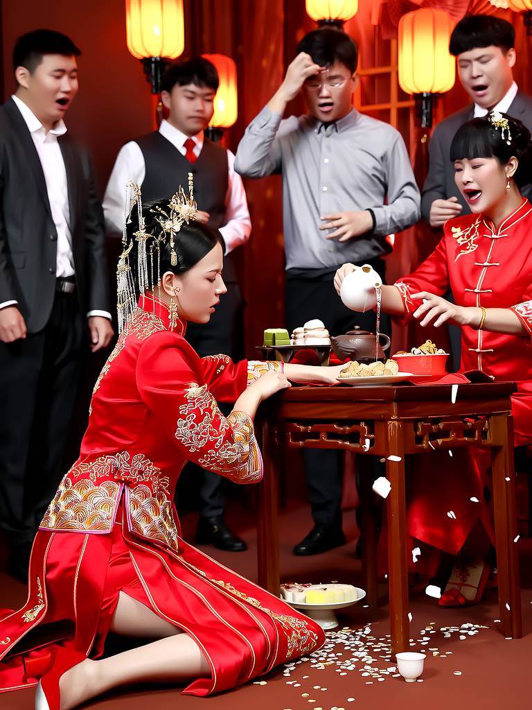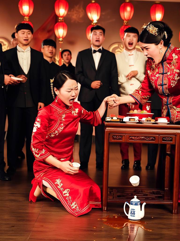 新娘婷婷尚未開口,婆婆竟猛地奪過她手中的茶盞,將尚溫的茶水朝著她臉上潑去!「嘩啦」一聲,茶水順著新娘的臉頰、脖頸流下,浸濕了衣襟。