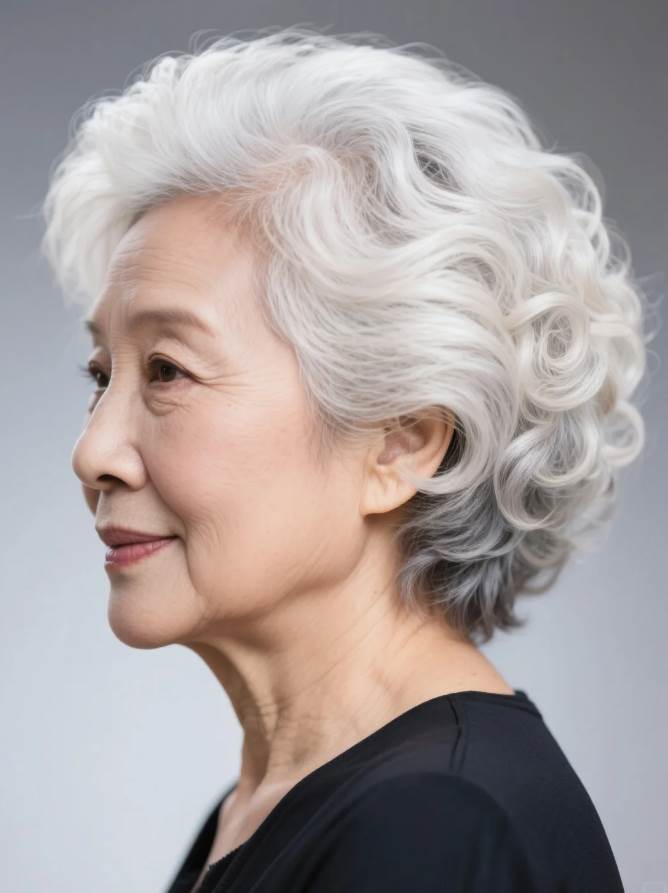 從頭頂開始、整齊劃一、捲度明顯的大波浪,雖帶有復古韻味,但對多數白髮短髮者而言,過于工整的線條容易顯得刻意、成熟,甚至帶點老派感。